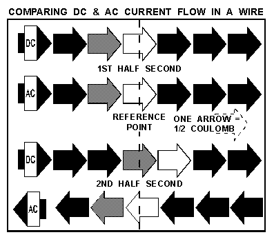 CONCEPTS OF ALTERNATING CURRENT All of your study thus far has been with direct current (dc), that is, current which does not change direction. However, as you saw in module 1 and will see later in this module, a coil rotating in a magnetic field actually generates a current which regularly changes direction. This current is called ALTERNATING CURRENT or ac. AC AND DC Alternating current is current which constantly changes in amplitude, and which reverses direction at regular intervals. You learned previously that direct current flows only in one direction, and that the amplitude of current is determined by the number of electrons flowing past a point in a circuit in one second. If, for example, a coulomb of electrons moves past a point in a wire in one second and all of the electrons are moving in the same direction, the amplitude of direct current in the wire is one ampere. Similarly, if half a coulomb of electrons moves in one direction past a point in the wire in half a second, then reverses direction and moves past the same point in the opposite direction during the next half-second, a total of one coulomb of electrons passes the point in one second. The amplitude of the alternating current is one ampere. The preceding comparison of dc and ac as illustrated. Notice that one white arrow plus one striped arrow comprise one coulomb. Q.1 Define direct current. DISADVANTAGES OF DC COMPARED TO AC When commercial use of electricity became wide-spread in the United States, certain disadvantages in using direct current in the home became apparent. If a commercial direct-current system is used, the voltage must be generated at the level (amplitude or value) required by the load. To properly light a 240-volt lamp, for example, the dc generator must deliver 240 volts. If a 120-volt lamp is to be supplied power from the 240-volt generator, a resistor or another 120-volt lamp must be placed in series with the 120-volt lamp to drop the extra 120 volts. When the resistor is used to reduce the voltage, an amount of power equal to that consumed by the lamp is wasted. Another disadvantage of the direct-current system becomes evident when the direct current (I) from the generating station must be transmitted a long distance over wires to the consumer. When this happens, a large amount of power is lost due to the resistance (R) of the wire. The power loss is equal to I2R. However, this loss can be greatly reduced if the power is transmitted over the lines at a very high voltage level and a low current level. This is not a practical solution to the power loss in the dc system since the load would then have to be operated at a dangerously high voltage. Because of the disadvantages related to transmitting and using direct current, practically all modern commercial electric power companies generate and distribute alternating current (ac). Unlike direct voltages, alternating voltages can be stepped up or down in amplitude by a device called a TRANSFORMER. (The transformer will be explained later in this module.) Use of the transformer permits efficient transmission of electrical power over long-distance lines. At the electrical power station, the transformer output power is at high voltage and low current levels. At the consumer end of the transmission lines, the voltage is stepped down by a transformer to the value required by the load. Due to its inherent advantages and versatility, alternating current has replaced direct current in all but a few commercial power distribution systems. Q.3 What is a disadvantage of a direct-current system with respect to supply voltage? |