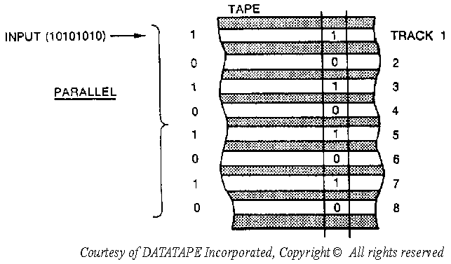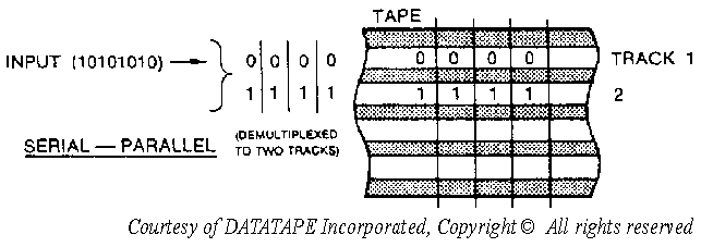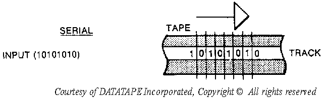 INTRODUCTION TO DIGITAL MAGNETIC TAPE RECORDING This chapter introduces you to digital magnetic tape recording. It describes (1) the three formats for digital magnetic tape recording, (2) the eight methods of encoding digital data onto magnetic tape, and (3) the configuration differences between the three types of digital tape recorders. Until now, you've learned about magnetic tape recording from an analog point-of-view. That is, the signal you record and reproduce is the actual analog input signal waveform. In digital magnetic tape recording, the signal you record and reproduce is, instead, a series of digital pulses. These pulses are called binary ones and zeros. These ones and zeros can represent one of three types of data: (1) data used by digital computers, (2) pulsed square-wave signals, or (3) digitized analog waveforms. The digital magnetic tape recording process stores data onto tape by magnetizing the tape to its saturation point in one of two possible polarities: positive (+) or negative (-). The saturation point of magnetic tape is the point where the magnetic tape is magnetized as much as it can be. DIGITAL MAGNETIC TAPE RECORDING FORMATS There are three digital magnetic tape recording formats: serial, parallel, and serial-parallel. Each of these is described below. Figure 7-1 shows each of the three formats as they apply to recording an eight-bit binary data stream. SERIAL DIGITAL MAGNETIC TAPE RECORDING FORMAT This is the simplest of the three digital magnetic tape recording formats. It's usually used when recording instrumentation or telemetry data. In this format, the incoming data pulses are recorded onto a single recorder track of the magnetic tape in a single, continuous stream. Figure 7-1A shows how this looks. Figure 7-1A. - Digital magnetic tape recording formats. PARALLEL DIGITAL MAGNETIC TAPE RECORDING FORMAT In this format, the incoming data pulses come in on more than one input channel and are recorded side-by-side onto more than one tape track. The data pulses across the width of the magnetic tape are related to each other. Figure 7-1B shows how this looks. This format is usually used to store computer data. Figure 7-1B. - Digital magnetic tape recording formats. SERIAL-PARALLEL DIGITAL MAGNETIC TAPE RECORDING FORMAT This format is more complex. It takes a serial input stream of data pulses, breaks them up, and records them on more than one recorder track. When the tape is reproduced, the recorder recombines the broken-apart data into its original form. Figure 7-1C shows how this looks. The serial-parallel format is usually used in instrumentation recording when the input data rate is high. Figure 7-1C. - Digital magnetic tape recording formats. DIGITAL MAGNETIC TAPE RECORDING DEFINITIONS Before we describe the methods for encoding digital data onto magnetic tape, let's define the following terms: Mark: The voltage state of a digital one (1) data bit. It's also sometimes called true. Space: The voltage state of a digital zero (0) data bit. It's also sometimes called false. Bit-cell period: The time occupied by a single digital bit. Packing density: The number of bits per fixed length of magnetic tape per track. There are three categories of packing density: