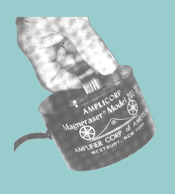 reel's flanges? TAPE ERASING AND DEGAUSSING One advantage of magnetic tape is that you can erase what you've previously recorded, and record on the same tape again and again. The erasing is done by demagnetizing the magnetic tape. You demagnetize a magnetic tape by exposing it to a gradually decreasing ac (alternating current) magnetic field. There are two ways to do this: (1) with an erase head that's mounted on the magnetic recorder, or (2) with a separate tape degausser. ERASE HEADS A magnetic recorder's erase head erases magnetic tape by saturating it with an ac signal that's higher in frequency than the frequency range of the recorder itself. This method of erasing a tape works well in some cases, but it's not the best way because: It's slow; the tape must be run through the recorder to be erased. If the erase head is not completely demagnetized, it may not do a complete erasure. Some recorders do not have erase heads installed. MAGNETIC TAPE DEGAUSSERS By far, the best way to erase a magnetic tape is to use a separate magnetic tape degausser. There are two types of degaussers: automatic and manual. Automatic Tape Degausser Automatic degaussers erase magnetic tape by automatically moving the whole tape reel or cartridge slowly and steadily in and out of an intense ac magnetic field. This type of degausser erases a tape very well. Some automatic degaussers are made specifically for tape reels, and some are made for both tape reels and tape cartridges. Figure 2-7 shows a typical automatic degausser. Figure 2-7. - Automatic tape degausser.