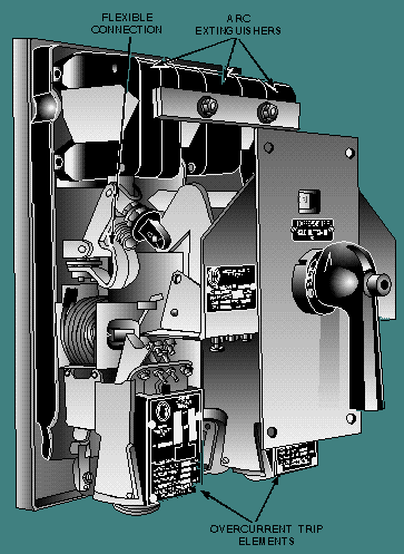 TRIP-FREE/NONTRIP-FREE CIRCUIT BREAKERS Circuit breakers are classified as being trip free or nontrip free. A trip-free circuit breaker is a circuit breaker that will trip (open) even if the operating mechanism (ON-OFF switch) is held in the ON position. A nontrip-free circuit breaker can be reset and/or held ON even if an overload or excessive heat condition is present. In other words, a nontrip-free circuit breaker can be bypassed by holding the operating mechanism ON. Trip-free circuit breakers are used on circuits that cannot tolerate overloads and on nonemergency circuits. Examples of these are precision or current sensitive circuits, nonemergency lighting circuits, and nonessential equipment circuits. Nontrip-free circuit breakers are used for circuits that are essential for operations. Examples of these circuits are emergency lighting, required control circuits, and essential equipment circuits. Circuit breakers, like fuses, are rated by the amount of time delay. In circuit breakers the ratings are instantaneous, short time delay, and longtime delay. The delay times of circuit breakers can be used to provide for SELECTIVE TRIPPING. Selective tripping is used to cause the circuit breaker closest to the faulty circuit to trip. This will remove power from the faulty circuit without affecting other, nonfaulty circuits. Figure 2-22 should help you understand selective tripping. Figure 2-22. - Use of circuit breakers in a power distribution system. Figure 2-22 shows a power distribution system using circuit breakers for protection. Circuit breaker 1 (CB1) has the entire current for all seven loads through it. CB2 feeds loads 1, 2, 3, and 4 (through CB4, CB5, CB6, and CB7), and CB3 feeds loads 5, 6, and 7 (through CB8, CB9, and CB10). If all the circuit breakers were rated with the same time delay, an overload on load 5 could cause CB1, CB3, and CB8 to trip. This would remove power from all seven loads, even though load 5 was the only circuit with an overload. Selective tripping would have CB1 rated as long time delay, CB2 and CB3 rated as short time delay, and CB4 through CB10 rated as instantaneous. With this arrangement, if load 5 had an overload, only CB8 would trip. CB8 would remove the power from load 5 before CB1 or CB3 could react to the overload. In this way, only load 5 would be affected and the other circuits would continue to operate. PHYSICAL TYPES OF CIRCUIT BREAKERS All the circuit breakers presented so far in this chapter have been physically large, designed to control large amounts of power, and used a type of toggle operating mechanism. Not all circuit breakers are of this type. The circuit breaker in figure 2-23 is physically large and controls large amounts of power; but the operating mechanism is not a toggle. Except for the difference in the operating mechanism, this circuit breaker is identical to the circuit breakers already presented. Figure 2-23. - Circuit breaker with an operating handle. Circuit breakers used for low power protection, such as 28-volt dc, 30 amperes, can be physically small. With low power use, arc extinguishers are not required, and so are not used in the construction of these circuit breakers. Figure 2-24 shows a low power circuit breaker of the push-button or push-pull type. This circuit breaker has a thermal trip element (the bimetallic disk) and is nontrip-free. The push button is the operating mechanism of this circuit breaker. Figure 2-24. - Push-button circuit breaker. You will find other physical types of circuit breakers as you work with electrical circuits. They are found in power distribution systems, lighting panels, and even on individual pieces of equipment. Regardless of the physical size and the amount of power through the circuit breaker, the basic operating principles of circuit breakers apply. Q.33 What is a trip-free circuit breaker? Q.34 What is a nontrip-free circuit breaker? Q.35 Where should you use a trip-free circuit breaker? Q.36 Where should you use a nontrip-free circuit breaker? |