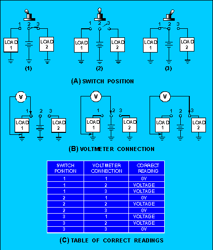 CHECKING SWITCHES There are two basic methods used to check a switch. You can use an ohm meter or a voltmeter. Each of these methods will be explained using a single-pole, double-throw, single-break, three-position, snap-acting, toggle switch. Figure 3-15 is used to explain the method of using an ohmmeter to check a switch. Figure 3-15(A) shows the toggle positions and schematic diagrams for the three switch positions. Figure 3-15(B) shows the ohmmeter connections used to check the switch while the toggle is in position 1. Figure 3-15(C) is a table showing the switch position, ohmmeter connection, and correct ohmmeter reading for those conditions. Figure 3-15. - Table of correct readings. With the switch in position 1 and the ohmmeter connected to terminals 1 and 2 of the switch, the ohmmeter should indicate (∞). When the ohmmeter is moved to terminals 2 and 3, the ohmmeter should indicate zero ohms. With the ohmmeter connected to terminals 1 and 3, the indication should be (∞). As you remember from chapter 1, before the ohmmeter is used, power must be removed from the circuit and the component being checked should be isolated from the circuit. The best way to isolate the switch is to remove it from the circuit completely. This is not always practical, and it is sometimes necessary to check a switch while there is power applied to it. In these cases, you would not be able to use an ohmmeter to check the switch, but you can check the switch by the use of a voltmeter. Figure 3-16(A) shows a switch connected between a power source (battery) and two loads. In figure 3-16(B), a voltmeter is shown connected between ground and each of the three switch terminals while the switch is in position 1. Figure 3-16(C) is a table showing the switch position, voltmeter connection, and the correct voltmeter reading. Figure 3-16. - Table of correct readings. With the switch in position 1 and the voltmeter connected between ground and terminal 1, the voltmeter should indicate no voltage (OV). When the voltmeter is connected to terminal 2, the voltmeter should indicate the source voltage. With the voltmeter connected to terminal 3, the source voltage should also be indicated. The table in figure 3-16(C)will show you the correct readings with the switch in position 2 or 3. When a switch is faulty, it must be replaced. The technical manual for the equipment will specify the exact replacement switch. If it is necessary to use a substitute switch, the following guidelines should be used. The substitute switch must have all of the following characteristics.