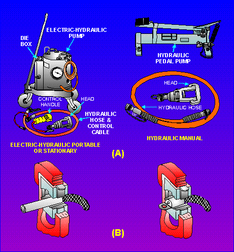 Figure 2-18. - Power crimping tools. The steps used for crimping an aluminum terminal or splice to an aluminum wire (view B of figure 2-18) are as follows: