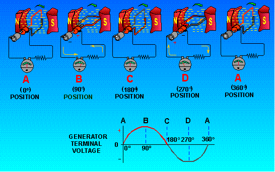 INTRODUCTION A generator is a machine that converts mechanical energy into electrical energy by using the principle of magnetic induction. This principle is explained as follows: Whenever a conductor is moved within a magnetic field in such a way that the conductor cuts across magnetic lines of flux, voltage is generated in the conductor. The AMOUNT of voltage generated depends on (1) the strength of the magnetic field, (2) the angle at which the conductor cuts the magnetic field, (3) the speed at which the conductor is moved, and (4) the length of the conductor within the magnetic field. The POLARITY of the voltage depends on the direction of the magnetic lines of flux and the direction of movement of the conductor. To determine the direction of current in a given situation, the LEFT-HAND RULE FOR GENERATORS is used. This rule is explained in the following manner. Extend the thumb, forefinger, and middle finger of your left hand at right angles to one another, as shown in figure 1-1. Point your thumb in the direction the conductor is being moved. Point your forefinger in the direction of magnetic flux (from north to south). Your middle finger will then point in the direction of current flow in an external circuit to which the voltage is applied. Figure 1-1. - Left-hand rule for generators. THE ELEMENTARY GENERATOR The simplest elementary generator that can be built is an ac generator. Basic generating principles are most easily explained through the use of the elementary ac generator. For this reason, the ac generator will be discussed first. The dc generator will be discussed later. An elementary generator (fig. 1-2) consists of a wire loop placed so that it can be rotated in a stationary magnetic field. This will produce an induced emf in the loop. Sliding contacts (brushes) connect the loop to an external circuit load in order to pick up or use the induced emf. Figure 1-2. - The elementary generator. The pole pieces (marked N and S) provide the magnetic field. The pole pieces are shaped and positioned as shown to concentrate the magnetic field as close as possible to the wire loop. The loop of wire that rotates through the field is called the ARMATURE. The ends of the armature loop are connected to rings called SLIP RINGS. They rotate with the armature. The brushes, usually made of carbon, with wires attached to them, ride against the rings. The generated voltage appears across these brushes. The elementary generator produces a voltage in the following manner (fig. 1-3). The armature loop is rotated in a clockwise direction. The initial or starting point is shown at position A. (This will be considered the zero-degree position.) At 0 the armature loop is perpendicular to the magnetic field. The black and white conductors of the loop are moving parallel to the field. The instant the conductors are moving parallel to the magnetic field, they do not cut any lines of flux. Therefore, no emf is induced in the conductors, and the meter at position A indicates zero. This position is called the NEUTRAL PLANE. As the armature loop rotates from position A (0) to position B (90), the conductors cut through more and more lines of flux, at a continually increasing angle. At 90 they are cutting through a maximum number of lines of flux and at maximum angle. The result is that between 0 and 90, the induced emf in the conductors builds up from zero to a maximum value. Observe that from 0 to 90, the black conductor cuts DOWN through the field. At the same time the white conductor cuts UP through the field. The induced emfs in the conductors are series-adding. This means the resultant voltage across the brushes (the terminal voltage) is the sum of the two induced voltages. The meter at position B reads maximum value. As the armature loop continues rotating from 90 (position B) to 180 (position C), the conductors which were cutting through a maximum number of lines of flux at position B now cut through fewer lines. They are again moving parallel to the magnetic field at position C. They no longer cut through any lines of flux. As the armature rotates from 90 to 180, the induced voltage will decrease to zero in the same manner that it increased during the rotation from 0 to 90. The meter again reads zero. From 0 to 180 the conductors of the armature loop have been moving in the same direction through the magnetic field. Therefore, the polarity of the induced voltage has remained the same. This is shown by points A through C on the graph. As the loop rotates beyond 180 (position C), through 270 (position D), and back to the initial or starting point (position A), the direction of the cutting action of the conductors through the magnetic field reverses. Now the black conductor cuts UP through the field while the white conductor cuts DOWN through the field. As a result, the polarity of the induced voltage reverses. Following the sequence shown by graph points C, D, and back to A, the voltage will be in the direction opposite to that shown from points A, B, and C. The terminal voltage will be the same as it was from A to C except that the polarity is reversed (as shown by the meter deflection at position D). The voltage output waveform for the complete revolution of the loop is shown on the graph in figure 1-3. Figure 1-3. - Output voltage of an elementary generator during one revolution. Q.1 Generators convert mechanical motion to electrical energy using what principle? |