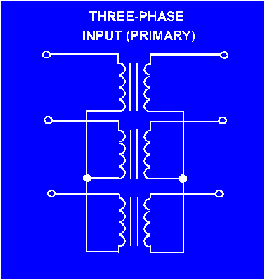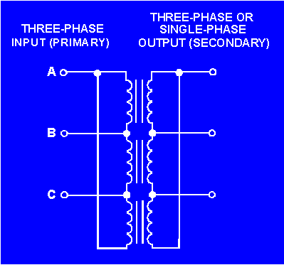 Figure 3-9. - Three-phase alternator or transformer connections. A three-phase transformer may be made up of three, single-phase transformers connected in delta, wye, or a combination of both. If both the primary and secondary are connected in wye, the transformer is called a wye-wye. If both windings are connected in delta, the transformer is called a delta-delta. Figure 3-10 shows single-phase transformers connected delta-delta for operation in a three-phase system. You will note that the transformer windings are not angled to illustrate the typical delta (Δ) as has been done with alternator windings. Physically, each transformer in the diagram stands alone. There is no angular relationship between the windings of the individual transformers. However, if you follow the connections, you will see that they form an electrical delta. The primary windings, for example, are connected to each other to form a closed loop. Each of these junctions is fed with a phase voltage from a three-phase alternator. The alternator may be connected either delta or wye depending on load and voltage requirements, and the design of the system. Figure 3-10. - Three single-phase transformers connected delta-delta. Figure 3-11 shows three single-phase transformers connected wye-wye. Again, note that the transformer windings are not angled. Electrically, a Y is formed by the connections. The lower connections of each winding are shorted together. These form the common point of the wye. The opposite end of each winding is isolated. These ends form the arms of the wye. Figure 3-11. - Three single-phase transformers connected wye-wye. The ac power on most ships is distributed by a three-phase, three-wire, 450-volt system. The single-phase transformers step the voltage down to 117 volts. These transformers are connected delta-delta as in figure 3-10. With a delta-delta configuration, the load may be a three-phase device connected to all phases; or, it may be a single-phase device connected to only one phase. At this point, it is important to remember that such a distribution system includes everything between the alternator and the load. Because of the many choices that three-phase systems provide, care must be taken to ensure that any change of connections does not provide the load with the wrong voltage or the wrong phase. Q.14 In a three-phase alternator, what is the phase relationship between the individual