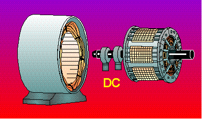 The three-phase induction motor also operates on the principle of a rotating magnetic field. The following discussion shows how the stator windings can be connected to a three-phase ac input and have a resultant magnetic field that rotates. Figure 4-4, views A-C show the individual windings for each phase. Figure 4-4, view D, shows how the three phases are tied together in a Y-connected stator. The dot in each diagram indicates the common point of the Y-connection. You can see that the individual phase windings are equally spaced around the stator. This places the windings 120 apart. Figure 4-4. - Three-phase, Y-connected stator. The three-phase input voltage to the stator of figure 4-4 is shown in the graph of figure 4-5. Use the left-hand rule for determining the electromagnetic polarity of the poles at any given instant. In applying the rule to the coils in figure 4-4, consider that current flows toward the terminal numbers for positive voltages, and away from the terminal numbers for negative voltages. Figure 4-5. - Three-phase rotating-field polarities and input voltages. The results of this analysis are shown for voltage points 1 through 7 in figure 4-5. At point 1, the magnetic field in coils 1-1A is maximum with polarities as shown. At the same time, negative voltages are being felt in the 2-2A and 3-3A windings. These create weaker magnetic fields, which tend to aid the 1-1A field. At point 2, maximum negative voltage is being felt in the 3-3A windings. This creates a strong magnetic field which, in turn, is aided by the weaker fields in 1-1A and 2-2A. As each point on the voltage graph is analyzed, it can be seen that the resultant magnetic field is rotating in a clockwise direction. When the three-phase voltage completes one full cycle (point 7), the magnetic field has rotated through 360. Q.6 What is the major difference between a two-phase and a three-phase stator? ROTOR BEHAVIOR IN A ROTATING FIELD For purposes of explaining rotor movement, let's assume that we can place a bar magnet in the center of the stator diagrams of figure 4-5. We'll mount this magnet so that it is free to rotate in this area. Let's also assume that the bar magnet is aligned so that at point 1 its south pole is opposite the large N of the stator field. You can see that this alignment is natural. Unlike poles attract, and the two fields are aligned so that they are attracting. Now, go from point 1 through point 7. As before, the stator field rotates clockwise. The bar magnet, free to move, will follow the stator field, because the attraction between the two fields continues to exist. A shaft running through the pivot point of the bar magnet would rotate at the same speed as the rotating field. This speed is known as synchronous speed. The shaft represents the shaft of an operating motor to which the load is attached. Remember, this explanation is an oversimplification. It is meant to show how a rotating field can cause mechanical rotation of a shaft. Such an arrangement would work, but it is not used. There are limitations to a permanent magnet rotor. Practical motors use other methods, as we shall see in the next paragraphs. SYNCHRONOUS MOTORS The construction of the synchronous motors is essentially the same as the construction of the salient-pole alternator. In fact, such an alternator may be run as an ac motor. It is similar to the drawing in figure 4-6. Synchronous motors have the characteristic of constant speed between no load and full load. They are capable of correcting the low power factor of an inductive load when they are operated under certain conditions. They are often used to drive dc generators. Synchronous motors are designed in sizes up to thousands of horsepower. They may be designed as either single-phase or multiphase machines. The discussion that follows is based on a three-phase design. Figure 4-6. - Revolving-field synchronous motor. To understand how the synchronous motor works, assume that the application of three-phase ac power to the stator causes a rotating magnetic field to be set up around the rotor. The rotor is energized with dc (it acts like a bar magnet). The strong rotating magnetic field attracts the strong rotor field activated by the dc. This results in a strong turning force on the rotor shaft. The rotor is therefore able to turn a load as it rotates in step with the rotating magnetic field. It works this way once it's started. However, one of the disadvantages of a synchronous motor is that it cannot be started from a standstill by applying three-phase ac power to the stator. When ac is applied to the stator, a high-speed rotating magnetic field appears immediately. This rotating field rushes past the rotor poles so quickly that the rotor does not have a chance to get started. In effect, the rotor is repelled first in one direction and then the other. A synchronous motor in its purest form has no starting torque. It has torque only when it is running at synchronous speed. A squirrel-cage type of winding is added to the rotor of a synchronous motor to cause it to start. The squirrel cage is shown as the outer part of the rotor in figure 4-7. It is so named because it is shaped and looks something like a turnable squirrel cage. Simply, the windings are heavy copper bars shorted together by copper rings. A low voltage is induced in these shorted windings by the rotating three-phase stator field. Because of the short circuit, a relatively large current flows in the squirrel cage. This causes a magnetic field that interacts with the rotating field of the stator. Because of the interaction, the rotor begins to turn, following the stator field; the motor starts. We will run into squirrel cages again in other applications, where they will be covered in more detail. Figure 4-7. - Self-starting synchronous ac motor. To start a practical synchronous motor, the stator is energized, but the dc supply to the rotor field is not energized. The squirrel-cage windings bring the 
