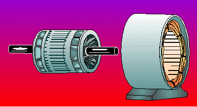 The induction motor is the most commonly used type of ac motor. Its simple, rugged construction costs relatively little to manufacture. The induction motor has a rotor that is not connected to an external source of voltage. The induction motor derives its name from the fact that ac voltages are induced in the rotor circuit by the rotating magnetic field of the stator. In many ways, induction in this motor is similar to the induction between the primary and secondary windings of a transformer. Large motors and permanently mounted motors that drive loads at fairly constant speed are often induction motors. Examples are found in washing machines, refrigerator compressors, bench grinders, and table saws. The stator construction of the three-phase induction motor and the three-phase synchronous motor are almost identical. However, their rotors are completely different (see fig. 4-8). The induction rotor is made of a laminated cylinder with slots in its surface. The windings in these slots are one of two types (shown in fig. 4-9). The most common is the squirrel-cage winding. This entire winding is made up of heavy copper bars connected together at each end by a metal ring made of copper or brass. No insulation is required between the core and the bars. This is because of the very low voltages generated in the rotor bars. The other type of winding contains actual coils placed in the rotor slots. The rotor is then called a wound rotor. Figure 4-8. - Induction motor. Figure 4-9. - Types of ac induction motor rotors. Regardless of the type of rotor used, the basic principle is the same. The rotating magnetic field generated in the stator induces a magnetic field in the rotor. The two fields interact and cause the rotor to turn. To obtain maximum interaction between the fields, the air gap between the rotor and stator is very small. As you know from Lenz's law, any induced emf tries to oppose the changing field that induces it. In the case of an induction motor, the changing field is the motion of the resultant stator field. A force is exerted on the rotor by the induced emf and the resultant magnetic field. This force tends to cancel the relative motion between the rotor and the stator field. The rotor, as a result, moves in the same direction as the rotating stator field. It is impossible for the rotor of an induction motor to turn at the same speed as the rotating magnetic field. If the speeds were the same, there would be no relative motion between the stator and rotor fields; without relative motion there would be no induced voltage in the rotor. In order for relative motion to exist between the two, the rotor must rotate at a speed slower than that of the rotating magnetic field. The. difference between the speed of the rotating stator field and the rotor speed is called slip. The smaller the slip, the closer the rotor speed approaches the stator field speed. The speed of the rotor depends upon the torque requirements of the load. The turning force can increase only if the rotor-induced emf increases. This emf can increase only if the magnetic field cuts through the rotor at a faster rate. To increase the relative speed between the field and rotor, the rotor must slow down. Therefore, for heavier loads the induction motor turns slower than for lighter loads. You can see from the previous statement that slip is directly proportional to the load on the motor. Actually only a slight change in speed is necessary to produce the usual current changes required for normal changes in load. This is because the rotor windings have such a low resistance. As a result, induction motors are called constant-speed motors. Q.8 Why is the ac induction motor used more often than other types? |