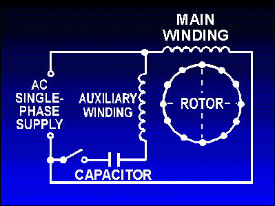 There are probably more single-phase ac induction motors in use today than the total of all the other types put together. It is logical that the least expensive, lowest maintenance type of ac motor should be used most often. The single-phase ac induction motor fits that description. Unlike polyphase induction motors, the stator field in the single-phase motor does not rotate. Instead it simply alternates polarity between poles as the ac voltage changes polarity. Voltage is induced in the rotor as a result of magnetic induction, and a magnetic field is produced around the rotor. This field will always be in opposition to the stator field (Lenz's law applies). The interaction between the rotor and stator fields will not produce rotation, however. The interaction is shown by the double-ended arrow in figure 4-10, view A. Because this force is across the rotor and through the pole pieces, there is no rotary motion, just a push and/or pull along this line. Figure 4-10. - Rotor currents in a single-phase ac induction motor. Now, if the rotor is rotated by some outside force (a twist of your hand, or something), the push-pull along the line in figure 4-10, view A, is disturbed. Look at the fields as shown in figure 4-10, view B. At this instant the south pole on the rotor is being attracted by the left-hand pole. The north rotor pole is being attracted to the right-hand pole. All of this is a result of the rotor being rotated 90 by the outside force. The pull that now exists between the two fields becomes a rotary force, turning the rotor toward magnetic correspondence with the stator. Because the two fields continuously alternate, they will never actually line up, and the rotor will continue to turn once started. It remains for us to learn practical methods of getting the rotor to start. There are several types of single-phase induction motors in use today. Basically they are identical except for the means of starting. In this chapter we will discuss the split-phase and shaded-pole motors; so named because of the methods employed to get them started. Once they are up to operating speed, all single-phase induction motors operate the same. Q.11 What type of ac motor is most widely used? Split-Phase Induction Motors One type of induction motor, which incorporates a starting device, is called a split-phase induction motor. Split-phase motors are designed to use inductance, capacitance, or resistance to develop a starting torque. The principles are those that you learned in your study of alternating current. CAPACITOR-START. - The first type of split-phase induction motor that will be covered is the capacitor-start type. Figure 4-11 shows a simplified schematic of a typical capacitor-start motor. The stator consists of the main winding and a starting winding (auxiliary). The starting winding is connected in parallel with the main winding and is placed physically at right angles to it. A 90-degree electrical phase difference between the two windings is obtained by connecting the auxiliary winding in series with a capacitor and starting switch. When the motor is first energized, the starting switch is closed. This places the capacitor in series with the auxiliary winding. The capacitor is of such value that the auxiliary circuit is effectively a resistive-capacitive circuit (referred to as capacitive reactance and expressed as XC). In this circuit the current leads the line voltage by about 45 (because XC about equals R). The main winding has enough resistance-inductance (referred to as inductive reactance and expressed as XL) to cause the current to lag the line voltage by about 45 (because XL about equals R). The currents in each winding are therefore 90 out of phase - so are the magnetic fields that are generated. The effect is that the two windings act like a two-phase stator and produce the rotating field required to start the motor. Figure 4-11. - Capacitor-start, ac induction motor. When nearly full speed is obtained, a centrifugal device (the starting switch) cuts out the starting winding. The motor then runs as a plain single-phase induction motor. Since the auxiliary winding is only a light winding, the motor does not develop sufficient torque to start heavy loads. Split-phase motors, therefore, come only in small sizes. RESISTANCE-START. - Another type of split-phase induction motor is the resistance-start motor. This motor also has a starting winding (shown in fig. 4-12) in addition to the main winding. It is switched in and out of the circuit just as it was in the capacitor-start motor. The starting winding is positioned at right angles to the main winding. The electrical phase shift between the currents in the two windings is obtained by making the impedance of the windings unequal. The main winding has a high inductance and a low resistance. The current, therefore, lags the voltage by a large angle. The starting winding is designed to have a fairly low inductance and a high resistance. Here the current lags the voltage by a smaller angle. For example, suppose the current in the main winding lags the voltage by 70. The current in the auxiliary winding lags the voltage by 40. The currents are, therefore, out of phase by 30. The magnetic fields are out of phase by the same amount. Although the ideal angular phase difference is 90 for maximum starting torque, the 30-degree phase difference still generates a rotating field. This supplies enough torque to start the motor. When the motor comes up to speed, a speed-controlled switch disconnects the starting winding from the line, and the motor continues to run as an induction motor. The starting torque is not as great as it is in the capacitor-start. Figure 4-12. - Resistance-start ac induction motor. Q.12 How do split-phase induction motors become self-starting? |