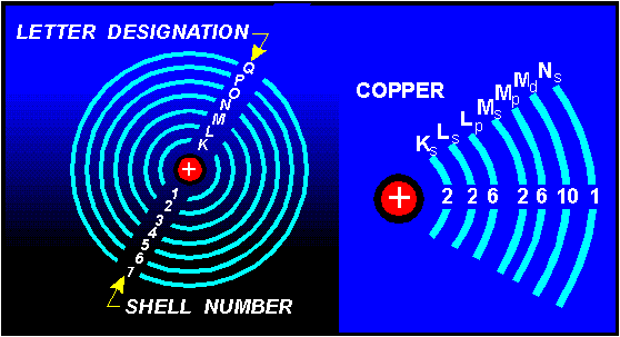 An ELECTRON carries a small negative charge of electricity. The PROTON carries a positive charge of electricity that is equal and opposite to the charge of the electron. However, the mass of the proton is approximately 1,837 times that of the electron. The NEUTRON is a neutral particle in that it has no electrical charge. The mass of the neutron is approximately equal to that of the proton. An ELECTRON'S ENERGY LEVEL is the amount of energy required by an electron to stay in orbit. Just by the electron's motion alone, it has kinetic energy. The electron's position in reference to the nucleus gives it potential energy. An energy balance keeps the electron in orbit and as it gains or loses energy, it assumes an orbit further from or closer to the center of the atom. SHELLS and SUBSHELLS are the orbits of the electrons in an atom. Each shell can contain a maximum number of electrons, which can be determined by the formula 2n2. Shells are lettered K through Q, starting with K, which is the closest to the nucleus. The shell can also be split into four subshells labeled s, p, d, and f, which can contain 2, 6, 10, and 14 electrons, respectively.