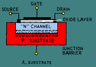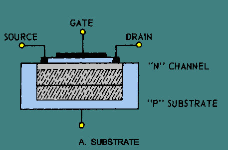 Another type of MOSFET is the induced-channel type MOSFET. Unlike the MOSFETs discussed so far, the induced-channel type has no actual channel between the source and the drain. The induced channel MOSFET is constructed by making the channel of the same type material as the substrate, or the opposite of the source and the drain material. As shown in figure 3-56, the source and the drain are of P-type material, and the channel and the substrate are of N-type material. Figure 3-56. - Induced channel MOSFET construction.