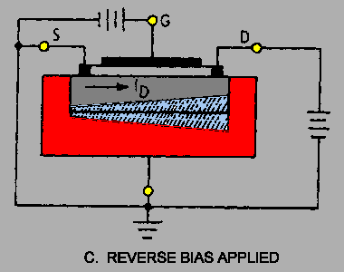 Figure 3-55 (view A, view B, and view C) illustrates the effect of forward bias on an enhancement mode N-channel MOSFET. In this case, a positive voltage applied to the gate increases the width of the current channel and the amount of drain current (ID). Figure 3-55A. - Effects of bias on N-channel enhancement MOSFET.