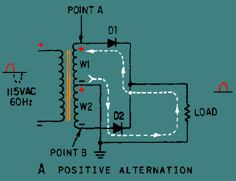 View B shows the next half cycle of secondary voltage. Now the polarities across W1 and W2 are reversed. During this alternation, the anode of D1 is driven negative and D1 cannot conduct. For the period of time that the anode of D1 is negative, the anode of D2 is positive, permitting D2 to conduct. Notice that the anode current of D2 passes through the load resistor in the same direction as the current of D1 did. In this circuit arrangement, a pulse of load current flows during each alternation of the input cycle. Since both alternations of the input voltage cycle are used, the circuit is called a FULL-WAVE RECTIFIER. Figure 4-5B. - Full-wave rectifier. NEGATIVE ALTERNATION