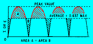 During the first half cycle (indicated by the solid arrows), the anode of D1 is positive with respect to ground and the anode of D2 is negative. As shown, current flows from ground (center tap), up through the load resistor (RL), through diode D1 to point A. In the transformer, current flows from point A, through the upper winding, and back to ground (center tap). When D1 conducts, it acts like a closed switch so that the positive half cycle is felt across the load (RL). During the second half cycle (indicated by the dotted lines), the polarity of the applied voltage has reversed. Now the anode of D2 is positive with respect to ground and the anode of D1 is negative. Now only D2 can conduct. Current now flows, as shown, from ground (center tap), up through the load resistor (RL), through diode D2 to point B of T1. In the transformer, current flows from point B up through the lower windings and back to ground (center tap). Notice that the current flows across the load resistor (RL) in the same direction for both halves of the input cycle. View B represents the output waveform from the full-wave rectifier. The waveform consists of two pulses of current (or voltage) for each cycle of input voltage. The ripple frequency at the output of the full-wave rectifier is therefore twice the line frequency. The higher frequency at the output of a full-wave rectifier offers a distinct advantage: Because of the higher ripple frequency, the output is closely approximate to pure dc. The higher frequency also makes filtering much easier than it is for the output of the half-wave rectifier. In terms of peak value, the average value of current and voltage at the output of the full-wave rectifier is twice as great as that at the output of the half-wave rectifier. The relationship between the peak value and the average value is illustrated in figure 4-7. Since the output waveform is essentially a sine wave with both alternations at the same polarity, the average current or voltage is 63.7 percent (or 0.637) of the peak current or voltage. Figure 4-7. - Peak and average values for a full-wave rectifier.