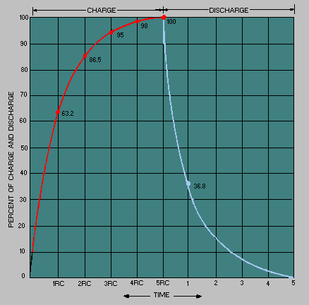 From your earlier studies in basic electricity, you may remember that one time constant is defined as the time it takes a capacitor to charge to 63.2 percent of the applied voltage or to discharge to 36.8 percent of its total charge. This action can be expressed by the following equation: t = RC Where: R represents the resistance of the charge or discharge path And: C represents the capacitance of the capacitor. You should also recall that a capacitor is considered fully charged after five RC time constants. Refer to figure 4-11. You can see that a steady dc output voltage is obtained when the capacitor charges rapidly and discharges as slowly as possible. Figure 4-11. - RC time constant.