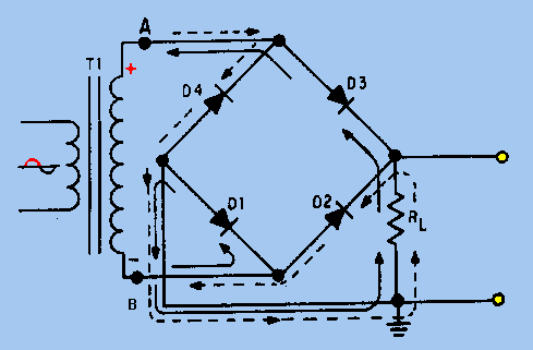 BRIDGE RECTIFIERS are full-wave rectifiers that do not use a center-tapped, high-voltage secondary. Because of this, their dc output voltage is equal to the input voltage from the high-voltage secondary of the power transformer. Bridge rectifiers use four diodes connected in a bridge network. Diodes conduct in diagonal pairs to give a full-wave pulsating dc output.