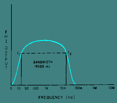 On figure 2-1, the two points marked f1 and f2 will enable you to determine the frequency-response limits of the amplifier. In this case, the limits are 15 hertz (15 Hz) and 20 kilohertz (20 kHz). You should now see how a frequency-response curve can enable you to determine the frequency limits and the bandwidth of an amplifier. |