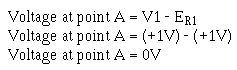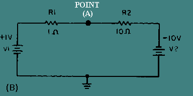 It is not necessary that the voltage supplies be equal to create a point of virtual ground. In view (B) V1 supplies +1 volt to the circuit while V2 supplies -10 volts. The total difference in potential is 11 volts. The total resistance of this circuit (R1 + R2) is 11 ohms. The total current (IT) is 1 ampere. The voltage drop across R1 (E R1 = R1 X IT) is 1 volt. The voltage drop across R2 (ER2 = R2 X I T) is 10 volts. The voltage at point A can be computed: