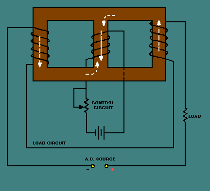 A SATURABLE-CORE REACTOR works upon the principle that increasing the current through a coil decreases the permeability of the core; the decreased permeability decreases the inductance of the coil which causes an increase in current (power) through the load.