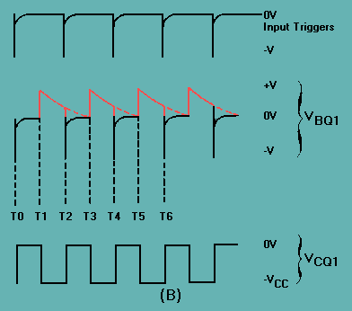 View (B) of figure 3-9 shows the waveforms associated with the circuit. At time T1, Q2 comes out of cutoff and goes into saturation. Also, Q1 is caused to come out of saturation and is cut off. The base voltage waveform of Q1 shows a positive potential that is holding Q1 at cutoff. This voltage would normally hold Q1 at cutoff until a point between T2 and T3. However, at time T2 another trigger is applied to the base of Q1, causing it to begin conducting. Q1 goes into saturation and Q2 is caused to cut off. This action repeats each time a trigger (T2, T4, T6) is applied. Figure 3-9B. - Triggered astable multivibrator and output.