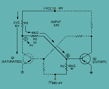 With Q1 saturated, a large current flows through R5. The meter would measure approximately 0 volts (ground potential) at point (C). Notice that point (B) is located between point (C) (at 0 volts) and +VBB (at +6 volts). The meter would measure a positive voltage (between 0 volts and +6 volts) at the base of Q2 (point (B)). |