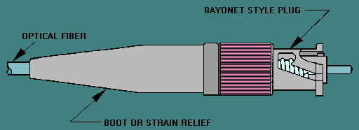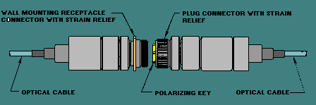 MILITARY CONNECTORS Light-duty connectors and heavy-duty connectors are two ways that the Navy classifies fiber optic connectors. Light-duty connector shipboard applications include locations that protect the connectors from the environment, such as in a junction box or equipment enclosure. Heavy-duty applications require a very rugged, stand-alone, sealed connector. A heavy-duty connector must also withstand pulls and tugs on the fiber cable without disrupting system operation. Light-duty connectors can be of the ferrule, biconical, or expanded-beam designs. Ferrule-type ST® connectors are becoming the commercial connector of choice for local area network (LAN) and data transfer links and are the standard connector for Navy light duty applications. This connector is described in specification sheets 16, 17, and 18 of MIL-C-83522. Figure 4-21 shows the ST® type of light-duty connector. Figure 4-21. - ST® light-duty connector. Figure 4-22 shows one type of heavy-duty connector designed for use in harsh Navy environments. This connector is described by the military specification MIL-C-28876. This connector comes in various sizes capable of terminating 2, 4, 6, or 8 fibers. Each fiber termination, called a terminus, is of the cylindrical ferrule type. Two slightly different termini are used to form a connection; a pin terminus and a socket terminus. The pin terminus consists of a terminus body, which holds the terminus within the connector shell and a ceramic ferrule. The socket terminus consists of a terminus body, a ceramic ferrule, and an alignment sleeve, which attaches to the ceramic ferrule. Fiber alignment occurs when the pin terminus slides into the alignment sleeve of the socket terminus. The termini are held within an insert in the connector shell. When the connector halves are mated, the connector inserts align the mating termini, which then align the mating fibers. The connector shell and backshell protect the termini from the surrounding environment and provide strain relief for the multifiber cable. Figure 4-22. - MIL-C-28876 heavy-duty connector. Q.30 The Navy classifies fiber optic connectors in what two ways? |