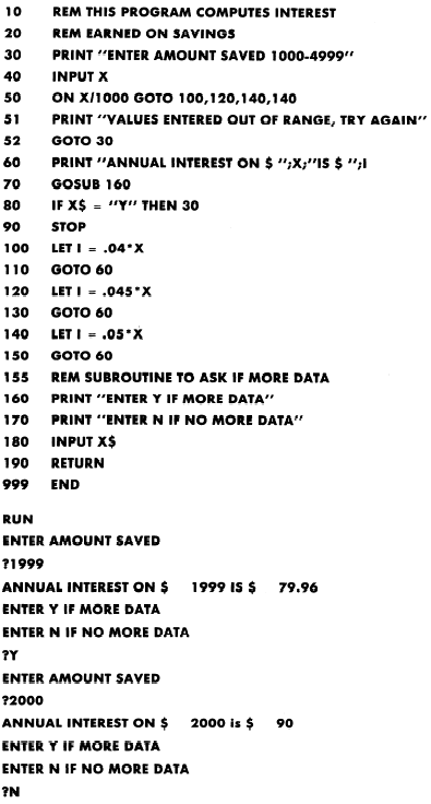 The GOSUB statement in line 70 transfers control to the subroutine, line
