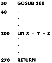 Line 30 transfers control to line 200, the first statement of the subroutine.