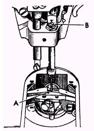 Figure 9-6.-Timing needle with shuttle. be in proper time for the machine to function properly. See figure 9-6. Timing the Needle with the Shuttle If a class 31 sewing machine does not form the lockstitch, if it skips stitches, or if it frays or breaks thread, the needle is not moving in the proper relationship with the shuttles motion. First make sure you have the right needle. Check the needle for the correct class, variety 16 x 87, and size. Insert the needle in the needle bar (long groove to the left) as far as it will go (fig. 9-6). Next compare the needle stroke to the shuttle stroke. To do this, remove the throat plate. Turn the balance wheel toward you until the point of the shuttle on its forward stroke reaches the center of the needle while the needle is on the upstroke. At this time, the needle bar should have risen 1/10 inch and the point of the shuttle should be 1/16 inch above the eye of the needle, as shown in A of figure 9-6. NOTE: Prior to making adjustments to the sewing machine, always follow the troubleshooting chart in Table 9-1. If the needle eye is not in this position, the following steps should be taken: 1. Loosen the needle bar connecting stud screw, as shown in B of figure 9-6. 2. Move the needle bar up or down as required; and then tighten the screw. 3. Rotate the balance wheel through the full cycle to check the timing. 4. Replace the throat plate. Timing the Feed Dog with the Needle The feed driving eccentric is an adjustable connection between the arm shaft (the shaft in the head) and the feed rock shaft (first shaft beneath the bed of the machine). If the feed mechanism is properly timed, the feed dog should be on its downstroke and level with the throat plate when the point of the needle reaches the material. If there is a twisted knot every 1 to 2 inches on the bottom of your material, check the timing of the needle before adjusting the feed mechanism. To adjust the feed eccentric, first lower the stitch regulator to the lowest position so the machine forms its longest stitch. Turn the balance wheel until the feed dog is on its downstroke and is flush with the throat plate. Move to the rear of the machine and take off the arm side cover. Turn the balance wheel away from you until the feed eccentric collar setscrew is visible (fig. 9-7). Hold the collar with your left thumb. Loosen the screw and rotate the balance wheel away from you until the needle, on its downstroke, reaches the material. Tighten the setscrew. Rotate the balance wheel to check the timing. Recheck the timing of the shuttle point with the needle. When you time the feeding mechanism, you may throw the needle out of time with the shuttle.