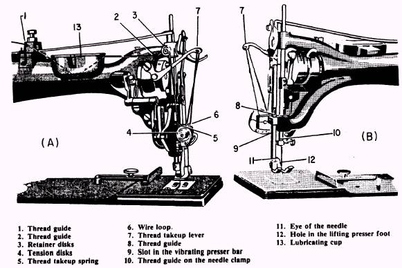 Figure 9-19.-Threading the 7-33 sewing machine. 9-15 guide (10), which is located on the needle clamp. The needle is now threaded from left to right through the eye of the needle (11). After the needle is threaded as shown in figure 9-19, pass the thread down through the hole in the lifting presser foot (12). Draw about 4 inches of thread through the hole in the lifting presser foot with which to begin sewing. Notice that the lubricating cup has been bypassed. No lubricant is used on the threads and cords used in the manufacture or repair of parachutes. |