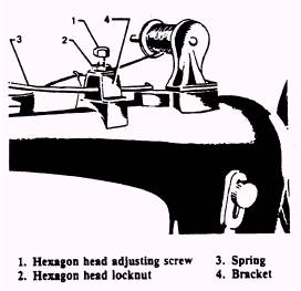 Figure 9-22.-Regulating the pressure on the material. the locknut is being tightened against the bracket (4). The pressure should be just heavy enough to enable the feed dog to move the work along evenly, and to prevent the work from rising with the needle. Preparing the Sewing The same sewing preparatory procedures are used for the 7-33 as for the 31-15 sewing machine, except there is no knee lifting device. The hand presser bar lifter is the only device provided for lifting the presser foot on the class 7-33 sewing machine. |