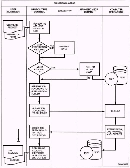 I/O CONTROL PROCEDURES I/O, as you know, stands for input/output. The people who perform I/O functions are called control clerks, I/O control clerks, job-staging clerks, distribution clerks, or computer aids. In short, these are the people who are responsible for the quality and control of data processing input and output media and products. They ensure that the data to be processed meets all the requirements as outlined in the input criteria (instructions and procedures), that all data are processed, that all processing steps are performed, that the output products are distributed to the appropriate users once they are complete. To be an efficient and effective I/O control clerk, you should be able to work on your own with a minimum of supervision; work well with other people; display tact and diplomacy; be a good communicator; use sound judgment; be logical, methodical, and persuasive; and most of all be able to respond to users' requests. Although you may manage to stay out of the limelight in this job, you do perform an integral function in the overall ADP operation. The importance and impact you have (whether it be aboard ship or ashore) is far-reaching and invaluable. Most opinions formulated by the AIS users (customers) are based on the quality of their output products and their personal contact with you as an I/O control clerk. Your attitude toward your job and its importance is seen not only by the customer, but also by your fellow workers, supervisor, and, in some cases, management. The quality of your work will be your signature when dealing with other AIS personnel and customers. I/O control is a process. Your job will be to follow your installation's procedures. Although the procedures may differ from one installation to another, they all require the same knowledge and skills. As an I/O control clerk, you act as the middle person between the user (customer) and the computer. Normally, the users come to you with a transmittal or request form and sometimes with their input-source documents, magnetic tapes, diskettes, and so on. Before accepting and logging in their jobs, take a few moments to look over the transmittal form. Be sure that all the necessary entries are properly filled in, that they are readable, and that any special instructions are understandable. It is better to clear up any misunderstandings right then and there, rather than having to contact the user again later and possibly cause a delay in the job getting on the computer. Never be embarrassed to ask questions. You must remember that many of the users you come in contact with are non-ADP oriented; therefore, it is up to you to help them understand the process and its requirements. Once you have logged the job in, you may work with data entry to prepare data or programs; then with the media library to pull the needed tapes or disks; and then with computer operations to have the job run. Once the job has been run on the computer, you may check the output products. When you are sure the outputs are OK, you distribute them according to instructions, log the job out, and file or return the job materials to the user. Study figure 1-1 for a few moments. It will help you see how the work flows and how you, as an I/O control clerk, fit in the picture. The functional areas are listed across the top of the figure. As you enter the level of middle management, you will be required to take on added duties and additional responsibilities. You will be a technical administrator, and you will provide support to management. You will use your expertise to evaluate current procedures and equipment and to make recommendations for improvements to operations. This includes estimating future equipment needs.