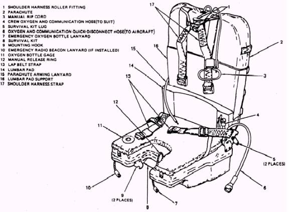 Figure 6-18.- Survival kit and parachute removed. emergency code card, water storage bag, a 50-foot nylon cord, and shark repellent. Operation As the seat moves up the guide rails during seat ejection, the aircraft-attached emergency oxygen lanyard is pulled automatically to actuate a supply of emergency oxygen. In the event of high-altitude ejection, the emergency oxygen provides protection against blackout while the crew member is descending to a safe altitude. By pulling the manual kit-release handle on the right side of the kit, the crew member may deploy the kit during parachute descent. Upon deployment of the kit, the top and bottom halves separate; both halves are still connected to the crew member by a retaining lanyard. The survival kit gear remains with the bottom half of the container (stowed in a zippered bag), while the life raft separates from the container. A self-contained pneumatic bottle automatically inflates the life raft, which remains attached to the crew member by means of the retaining lanyard. Parachute deployment occurs following the crew member/ seat separation phase of normal seat ejection. If the crew member is above a preset pressure altitude of 14,000 ( 500) feet, an aneroid in the parachute barometric actuator delays parachute deployment until the crew member has descended to the correct pressure altitude. The parachute actuator delay cartridge then fires, causing parachute deployment. The parachute also can be deployed manually by pulling a conventional D-ring rip cord.