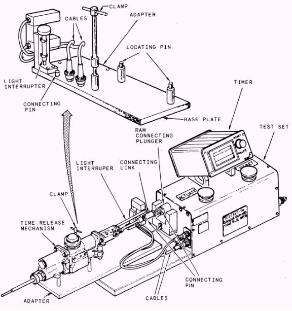 Figure 6-27.- Time-release mechanism time delay check-out electrical cables to the time-delay set timer. Then connect the test set to a 110-volt ac 60-Hz power supply. Again, you will need an air source regulated to 80 psi. 2. Extend the ram connecting plunger on the test set by pressing the reset button. Position the TRM on the test set and secure it with a test set clamp. Attach the time-delay g-sensing release mechanism firing link to the test set ram connecting plunger, connecting link, and con-necting pins. NOTE: At this point, you should ensure QA personnel are present to witness the elapsed time function. 3. Press the time-delay test set actuate button and record the time required to pull the firing link from the time-release g-sensing release mechanism. The elapsed time should not exceed 1.5 0.1 seconds. If the time is greater than 1.5 0.1 seconds, the unit must be replaced.