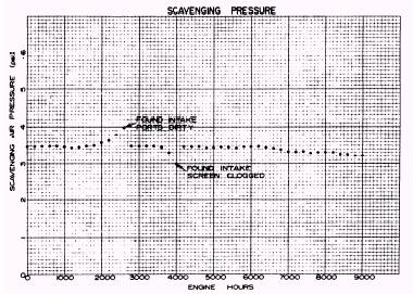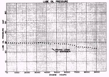 that may be expected are also included. On figures 2-8 and 2-9, a high, average, and low value is plotted for both firing and compression pressures. Under normal conditions these curves will remain flat until the engine is approaching the time of overhaul, then the curves will start to fall off. The high and low firing pressures will remain at about 50 psi (100 psi spread) from the average firing pressure for a well-balanced engine. If you look at figure 2-8 you can see that a decided drop in firing pressure has occurred at 1600 hours (point A). This failure in the compressing pressures indicates that the rings are either sticking, broken, or beginning to wear; that the valves are not functioning properly; or that the liner is beginning to score or possibly that a piston has cracked. Remember that any change in a curve (beyond normal limits) indicates that immediate attention is required. At this point, it should be pointed out that more than one indicator will usually reveal the same distress signal. Therefore, before any corrective action is taken, it is best to make a study of other curves to deny or confirm the problem. In this case check the lube oil consumption, crankcase vacuum, and exhaust temperature curves. In figures 2-9, 2-10, and 2-15 the typical indications for this problem