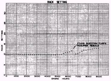 Figure 2-15.Lube Oil Consumption Graph. are marked as point A. All indications point to a definite internal problem in one cylinder. No rise in lube oil consumption is indicated (point A on figure 2-15) because a slightly worn set of rings or liner probably would not cause a measurable increase in lube oil consumption. The logs should now be consulted to find the problem cylinder and initiate appropriate repairs. If only firing pressures and exhaust temperature are low, the fuel system should be checked on the problem cylinder. The crankcase vacuum graph (figure 2-10) indicates ring, piston, or liner condition. As long as everything is normal, this curve will also be flat. A cracked piston, worn rings, or liner will increase blow-by, causing decreased crankcase vacuum. If crankcase vacuum decreases with no change in other indicators, the crankcase scavenging system should be checked for proper operation. An increase in crankcase vacuum may be caused by a clogged intake screen. The exhaust temperature graph (figure 2-11) indicates general cylinder conditions and engine balance, although this item is not necessarily a definite indication of trouble itself. Any abnor-mal temperature with no accompanying change in the various other indicators can usually be attributed to a faulty pyrometer. The pyrometer in question should then be carefully inspected and tested before any other inspections or adjustments are accomplished. The lube oil pressure graph (figure 2-12) indicates the engine bearing condition, lube oil pump condition, piping conditions, by-pass relief valve conditions, etc. Lube oil pressure obtained at the upper header of Fairbanks Morse opposed piston engines is particularly useful in monitoring the condition of the internal portion of the lube oil system. The manifold pressure graph (figure 2-13) indicates the condition of the scavenging system. Increasing air box pressures indicate port clogging, while reduced air box pressures indicate some abnormality in the air intake systems, blower, or turbocharger. Both of these cases re-quire immediate attention. The fuel rack or governor power piston position graph (figure 2-14) indicates the general condition of the fuel system. Increased rack settings for a given power output indicate fuel pump deterioration or a decrease in engine combustion efficiency. The lubrication oil consumption graph (figure 2-15) is for the lubricating oil consumption in gallons per 200 hours operation. It should be noted that the values on this curve are initially very high. They decrease and then remain nearly constant until the engine is approaching its overhaul time. The initial high consumption is due to unseated piston rings. As rings become seated, the consumption will decrease to a normal value and remain nearly constant until the rings or liners begin to wear. Any significant increase in lube oil consumption must be carefully evaluated to deter-mine if the oil is really being consumed in the engine or is being lost because of external leaks. Too many times an engine is assumed to be at fault when lube oil is really being lost due to leakage. Review of figures 2-8 through 2-15 will also indicate other problems that are not discussed in this text. Each sample problem is marked on the various graphs at the appropriate engine hours so a study of the samples can be made. In conclusion, operational graphs show the condition of the engine. They show what is happening, what needs to be done, and what has to be planned for in advance. The life expectancy of vital parts can be determined from these curves, and the parts can be renewed before they reach the point of failure. The trend analysis program must be followed closely, especially during the initial period of the program when care must be taken to ensure that the data gathered are meaningful. However, if the condition of any particular engine indicates that an overhaul is required to maintain it operational, this should be accomplished at the earliest possible time. |