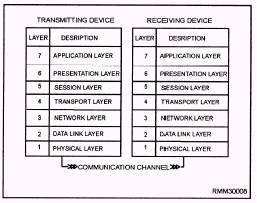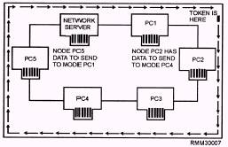 Figure 1-7.\A ring network using the token passing access method. printer is used by all nodes, how one file is passed among many users, and so on. If order and discipline are to be maintained on the network, standards or protocols must be established and adhered to. This allows the LAN to function in an efficient and effective manner. Over the past few years, a number of network standards or protocols have been developed by the International Standards Organization (ISO). They provide some level of uniformity among computer manufacturers and network vendors. ISO is one of several governing organizations in this field that has developed a series of protocols (rules to live by) to ensure compatibility for the many different vendors who design network hardware and software products. IS0 has defined a seven-layer architecture. These seven layers of standards, shown in figure 1-8, define a generalized architecture called the Reference Model of open Systems Interconnection. It is also known as the OSI reference model or OSI model. The primary purpose of the OSI model is to provide a basis for coordinating the development of standards that relate to the flexible interconnection of incompatible systems using data communications facilities. The OSI model does NOT define any one vendor's particular network software as such, nor does it define detailed standards for any given software. It simply defines the broad categories of functions that each of the seven layers should perform. The OSI model can include different sets of standards at each layer that are appropriate for given situations. For example, in a very simple data communications system, one that uses a simple point-to-point link, the software at the higher-