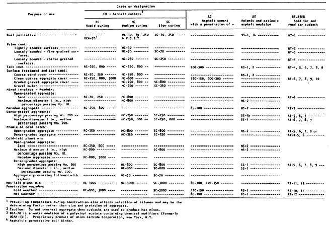 Table 13-7.Typical Uses of Bituminous Materials bituminous coal is destructively distilled, coke and gas are formed, and tar, ammonia, light oils, sulfur, and phenol may be recovered. Coke-oven tar is produced in the greatest amount, and its chemical, physical, and adhesive characteristics make it most suitable for road-tar purposes. Water-gas tar is obtained in the manufacture of carbureted (mixed with hydrocarbons) water gas. The nature of the carbureting oil largely determines the character of the water-gas tar produced. This tar may vary widely in specific gravities, viscosities, and other physical and chemical properties. Road tars are manufactured in 12 grades of viscosity (figs. 13-27 and 13-28). There are also some special grades for use in rubberized-tar binders. Grades 1 through 7 are liquid at room temperature, and grades 8 through 12 are semisolid or solid. The difference occurs because of different amounts of the liquid coal distillates in the tar; the more distillate, the more liquid (or less solid) the tar. The road-tar cutbacks (RTCBs) are the products of cutting back the heavier or harder grades Tar, which is insoluble in petroleum distillates, is sometimes mixed with oil-resistant, unvulcanized rubber to form a rubberized-tar binder material. |