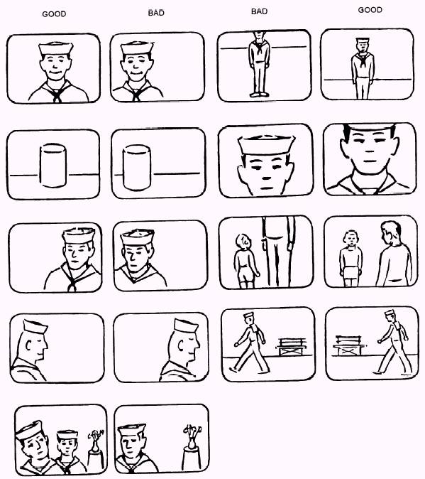 Figure 13-10. Long shot, medium shot, and closeup shot progression. simple line drawing examples of TV framing (fig. 13-9) indicates how to stage and show elements within the confines of the small 3:4 fixed aspect ratio of a television picture. Use high- and low-camera angles with caution. High angles tend to shorten the legs of a person. Low angles may distort the body and face of the subject. Of course, watch for objects that seem to be growing out of or are balanced on a person's head. Area of Talent Included Most motion-media assignments involve people. You may find it convenient to identify people shots by the section of the body that is included in the frame. The person's head is usually in the top of the picture; therefore, shots vary according to the lowest part of the talent shown at the bottom of the screen. Thus the terms used to describe various people shots are as follows: full figure shot, knee shot, thigh shot, waist shot, bust shot, head shot, tight head shot. Number of People Included The shot designations that are easiest to remember are the ones that refer to the number of people included in the picture. When only one person is to be shot, it is a one-shot. Obviously, a shot that shows two people is a two-shot, three people make a three-shot, and so on; however, when five or six people are pictured it is called a group-shot. A crowd-shot is when a large group of 20 or more people is being framed. |