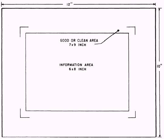 Figure 13-15. The 3:4 ratio used for a video graphic. Get in close enough with the video camera to show clearly all detail, but not so close that some of the information area is lost. Avoid using a wide-angle lens. Besides the possibility of camera shadows falling on the graphic, distortion is likely to occur and will be most noticeable when panning over the graphic. A longer focal-length lens overcomes the distortion problem, but is less smoothly panned. LIGHTING Because light reflections can obscure detail on a shiny graphic, the experienced graphic artist and photographer will avoid glossy materials and glossy photographs. However, when it is causing objectionable reflections, the graphic can sometimes be tilted slightly to help clear them; otherwise, relighting or surface dulling may become necessary. The lighting for a TV graphic is similar to lighting reflection originals in copy work. Graphics must be flat. Unmounted, warped, or curved surfaces easily show unwanted reflections. SAFE TITLE AREA In the production of slides for use as television graphics, important picture information must be confined within the area of the TV monitor.