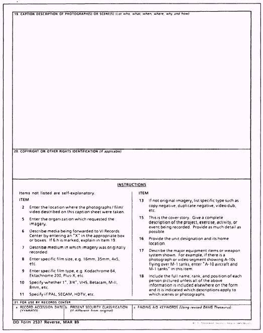 Figure 13-18B. Visual information caption sheet (back). condition it to room temperature. Complete dimensional equilibrium may take as much as about 16 hours. Never use direct heat to speed up the conditioning process. High temperatures can create harmful differences in layer-to-layer tension on the reel. Never use extreme cold, such as a freezer, to cool down a hot tape. In general, recommended storage conditions for videotapes are as follows: Relative Humidity . . . . . 50% - 60% Temperature . . . . . . . . 60F - 80F For best long-term storage, rewind video cassettes uniformly for even tension before boxing. Tapes should always be in one of two places-in the VTR or in the original box. Stand videotape boxes upright. Do not store tapes in a horizontal position. This can cause bending and distorting of reel flanges that can be a major cause of tape edge damage. To prevent damage, you should protect videotapes by covering them when they are not in use. Keeping them in dustproof cassette containers prevents the accumulation of airborne dust on the tapes. Dust can be a prime cause of dropout. Body oils and salts from your fingertips can pick up and hold foreign particles that, when transferred to the tape, cause dropouts. |