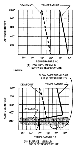 Figure 5-16.-Nocturnal cooling over a land area producing stratus (10- to 15-knot wind). (A) 1530 local maximum surface temperature; (B) sunrise-minimum surface temperature.this air mass moves inland (replacing warm, dry, land air), it may be cooled to saturation due to radiational cooling during the long autumn nights with consequent formation of fog or stratus. The fog is limited to the coastal areas, extending inland between 150 and 250 miles, depending on the wind speed. On the east coast, it is limited to the region between the Appalachian Mountains and the Atlantic Ocean.