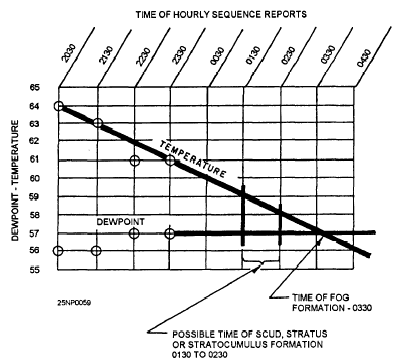 Figure 5-17.-Saturation time chart. (0s indicate actual temperature and dewpoint observations. Straight line is forecast temperature-dewpoint trends.)In late fall and winter, when continental temperature gradients have intensified, and the land temperature has become colder than the adjacent water, poleward moving air is cooled by advection over colder ground, as well as by radiation. If the air is sufficiently moist, fog or stratus may form. During daytime, heating may dissipate the fog or stratus entirely. If not, the heating, together with the wind, which is advecting the air, sets up a turbulence inversion and stratus or stratocumulus layers form at the base of the inversion. At night if the air is cooled again and the surface pressure gradient is weak, a surface inversion may replace the turbulence inversion, and fog again occurs at the surface. However, if the pressure gradient is strong, cooling will intensify the inversion. Under these conditions stratus or stratocumulus clouds occur just as in the daytime, except with lower cloud bases.Late fall and winter advection-radiation fogs cart occur any place over the continent that can be reached by maritime air or modified returning continental air. Mainly, this occurs over the eastern half of the United States. However, since tropical air masses do not reach as high a latitude in winter as in summer, the frequency of such fogs are much less in the northern regions of the country. With large, slow-moving, continental warm highs over the eastern half of the country, however, the fogs may extend all the way from the Gulf of Mexico to Canada.This information is now available on CD in Adobe PDF Printable Format |