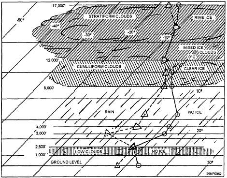 Figure 5-21.-The 8D ice forecast method. will be no supercooled droplets, but hoarfrost will form on the aircraft through direct sublimation of water vapor. . When the temperature curve lies to the right of the 8D curve in a subfreezing layer, the layer is subsaturated with respect to both ice and water surface. No icing will occur in this region. This information is now available on CD in Adobe PDF Printable Format |
