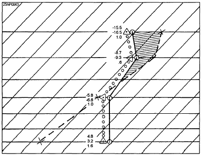 Figure 5-20.-An illustration of the analysis of cloud type and icing type from a Skew T Log P Diagram. from the Skew T Log P Diagram by using the following 7 steps: 1. Plot the temperature against pressure as determined from a RAOB sounding. 2. Record the temperature and dewpoint in degrees and tenths to the left of each plotted point. 3. Determine the difference (in degrees and tenths) between the temperature and dewpoint for each level. This difference is D, the dewpoint deficit; it is always taken to be positive. 4. Multiply D by 8 and plot the product (which is in degrees Celsius) opposite the corresponding temperature point at the appropriate place. 5. Connect the points plotted by step 4 with a dashed line in the manner illustrated in figure 5-21. 6. The icing layer is outlined by the area enclosed by the temperature curve on the left and the 8D curve on the right. In this outlined area, supersaturation with respect to ice exists. This is the hatched area, as shown in figure 5-21. 7. The intensity of icing is indicated by the size of the area enclosed by the temperature curve and the 8D curve. In addition, the factors given in the following section should be considered when formulating the icing forecast. The cloud type and the precipitation observed at the RAOB time or the forecast time maybe used to determine whether icing is rime or glaze. Conclusions arrived at by using the-SD method for forecasting icing: . When the temperature and dewpoint coincide in the RAOB sounding, the 8D curve must fall along the 0C isotherm. In a subfreezing layer, the air would be saturated with respect to water and supersaturated with respect to ice. Light rime icing would occur in the altostratus/nimbostratus clouds in such a region, and moderate rime icing would occur in cumulonimbus clouds in such a region. Severe clear ice would occur in the stratocumulus virga, cumulus virga, and stratus. . When the temperature and dewpoint do not coincide but the temperature curve lies to the left of the 8D curve in the subfreezing layer, the layer is supersaturated with respect to cloud droplets. If the clouds in this layer are altostratus, altocumulus, cumulogenitus, or altocumulus virga, only light rime will be encountered. If the clouds are cirrus, cirrocumulus, or cirrostratus, only light hoarfrost will be sublimated on the aircraft. In cloudless regions, there