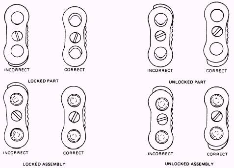 Figure 1-18.-Locked and unlocked connector links. 2. If required, examine the yoke and plate assembly for proper installation (fig. 1-18). When the yoke and plate assembly screw is tightened, there should be a maximum of 1/64-inch play in the assembly. (To tighten the screw use a torque of 20 to 25 lb-in.) At this point, a mandatory inspection is performed by a quality assurance inspector. All of your work stops until the mandatory inspection is performed and the assembly has been found acceptable. BALLISTIC SPREADING GUN INSPECTION While inspecting the ballistic spreading gun, you may have to remove, replace, or make some adjustment. All work must be in accordance with the procedures in the applicable chapter of the NAVAIR 13-1-6.2. The ballistic spreading gun is described in the next chapter of this text. HARNESS/RISER ASSEMBLY INSPECTION Inspect the harness webbing for signs of contamination from oil, grease, acid, or other foreign matter, such as rust at points of contact with metal parts. Inspect for cuts, twists, fading, excessive wear or fusing (indicated by unusual hardening or softening of webbing fibers), fraying, burns, abrasions and loose or broken stitching (in excess of three stitches). If applicable, inspect the four-line-release lanyard flute for wear and proper attachment. If you find any damage to the harness, dispose of it and replace it in accordance with applicable rigging and packing procedures. When a replacement harness is installed, you should stencil the date, preceded by the letter R, in the center of the horizontal back strap in letters 1/2-inch high. For example, R-2-88 indicates a replacement was made in February 1988. If fewer than three stitches are loose or broken, repair the riser or harness assembly by using nylon 6-cord, lock-stitch over original stitch and 3/4 inches on both sides of the original. Use four to six stitches per inch. Hardware Inspection To inspect harness and riser hardware, proceed as follows: 1. Inspect the canopy quick-release fittings for breaks, corrosion, pitting, bends, dents, and sharp edges. Check the tamper-dot on the locking screw. If it is broken, tighten it and apply a new tamperdot to the screwhead using lacquer (TT-L-32, 11136, insignia red) or equivalent. Remove sand or any dirt from the mechanism using an air hose to blow it out at not more than 50 psi pressure. Wipe dirt and grease from fittings with a clean rag. Do not lubricate the fittings. Replace all damaged fittings. 2. With the canopy quick-release fitting locking cover plate held in the open position, insert a torquemeter into the hexagonal cavity located on either end of the knurled locking-lever shaft. With the canopy quick-release fitting locking cover plate held in the open position, rotate the knurled lever shaft until it reaches the stop. Record the torque reading. The allowable torque is 28 to 50 ounce-inches. All canopy quickrelease fittings that do not meet torque test requirements must be replaced. 3. Inspect all other hardware for signs of corrosion, pitting, ease of operation, security of attachment, bends, dents, nicks, burrs and sharp edges. Make sure that the rollers in the roller yokes turn freely. If you find any parts damaged, forward the riser or harness assembly to supply for screening. NOTE: Hardware that has been rejected is forwarded to the Commanding Officer, Naval Weapons Center, China Lake. California, Attention: Code END, 4. Cross-Connector Strap Inspection Inspect the cross-connector strap(s) for signs of contamination, cuts, fraying, burns, and loose or broken stitching. If you find any damage, dispose of them locally, and replace them in accordance with applicable rigging and packing procedures.