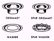 Figure 10-10.-Grommets-p1ain and spur. the smaller the number, the smaller the size of the grommet. To install grommets, you must proceed through a series of operations. Locate and mark where a grommet installation is needed. Be sure you set the grommet far enough from the edge of material to prevent it from tearing. Select the correct punch by matching its size to the size of the grommet collar, as shown in figure 10-11. After you have used the leather cutting punch to cut a hole in the fabric, you must mate the parts of the grommet. Place the grommet on the finished side of the material and the washer underneath. Determine the correct size chuck and die. Assemble the grommet, washer, punch, and die, as illustrated in figure 10-12. Now you are ready to flatten the collar. This operation can be accomplished in a variety of ways, depending upon the availability of tools .