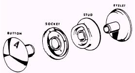 Figure 10-16.-Three-way locking snap-type fastener. parachute containers, and back pads. (See figure 10-16). This fastener opens only when lifted from the side, with the dot located on the top of the button. When installing this snap fastener, you should ensure that you install the three-way locking snap in the position that you want to be opened. This type of snap should never be used where any quick-opening devices or quickreleasing action is required. The curtain type fastener (lift-the-dot) is stocked in two sizes-large and small. (See figure 10-17). These fasteners have many uses, especially for truck and boat covers. The small lift-the-dot is the same as the large one, and designed on a smaller scale for use on lighter work where the bulkiness and weight of the large lift-the-dot are not desired. Tasks are accomplished more easily and quickly through the use of interlocking fasteners. For example, they save precious seconds for an aircrewman when he is donning his flight clothing or exposure suit. These fasteners also provide the repairman with a means of easy access to items that require inspections. The types of interlocking slide fasteners (zippers) used on flight clothing and other items of aviation equipment are shown in