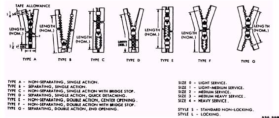 Figure 10-18.-Slide fasteners. Figure 10-19 shows the parts of an interlocking fastener. Interlocking Slide Fastener Construction An interlocking slide fastener consists of two chains of teeth (hollow cones or scoops) facing each other. When brought together at the proper angle, each tooth fits within the scoop of the tooth opposite it. When closed, the interlocking slide fastener teeth cannot be parted except through the use of the slider, which, when moved, displaces teeth at the proper angle for meshing and unmeshing. The small clips (stops) at the top and bottom of the interlocking slide fastener are designed to prevent the slider from running off the track. Separatingtype slide fasteners do not have a bottom stop, but are equipped with a pin on one side and retainer arrangement on the other to allow the two parts of the slide fastener to separate. |