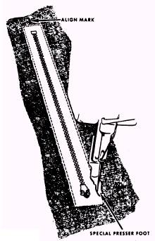 Shortening an Interlocking Slide Fastener To shorten an interlocking slide fastener, first determine the length required. The chain should be about one-half inch shorter than the opening in the material or garment. Mark the desired length, measuring from the bottom stop upward. Open the chain to any point below this mark and cut directly across the tape about 1 inch above the mark. Cut the excess teeth from the marking point to the end of the tape, and replace the two stops, crimping them firmly. Installing an Interlocking Slide Fastener The installation of an interlocking slide fastener varies with the type of job. Some are curved, some have rounded comers, and some are hidden. The installation of a straight slide fastener is described in the following paragraphs. Slide Fastener Presser Foot To install a slide fastener neatly and easily, you should use a slide fastener presser foot on the sewing machine. The slide fastener presser foot serves not only as a guide for a neat row of stitches, but also prevents the foot from riding up on the chain. The sewing machine manufacturer can supply a regular slide fastener presser foot (right or left) for any sewing machine, or one can be made locally. File or grind the left side of an old presser foot to permit sewing to within 1/8 inch of the chain. Fabrication When sewing, always stretch the slide fastener and not the material, as this makes a flatter and neater job.
