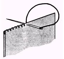 will be between the two pieces of material. Form the overthrow stitch by inserting the needle angles to the material, as shown in figure 10-27.