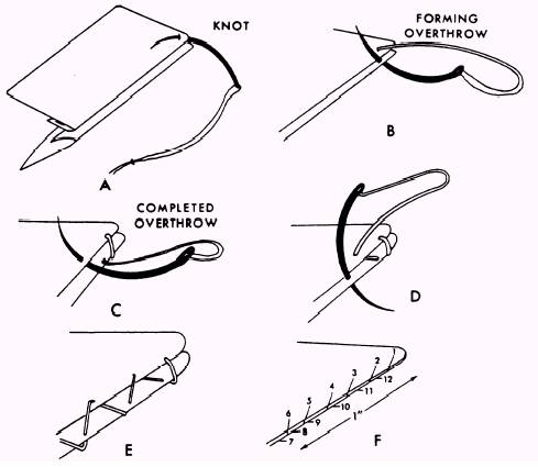 make six stitches per inch. At the end of the row, one-eighth inch from the folded edge and at right tie off the thread with two half hitches. Sewing the Baseball Stitch The baseball stitch is a useful, permanent stitch, because it is very flexible and very elastic. It pulls the edges of material (cloth or leather) evenly together to form a flat surface, and it is used for repair or closing an opening. The thread lies on both the top and bottom edges of the material. Like lacing, it can be pulled as tightly as desired. Usually a curved needle is used to sew the baseball stitch. Thread the needle with the required type of cord, waxed and tied with a knot at the end. If it is fabric to be sewn, rather than leather, turn the edges under one-half inch. Insert the needle through the fold of one ply of material to hide the knot, as shown in figure 10-28. Insert the